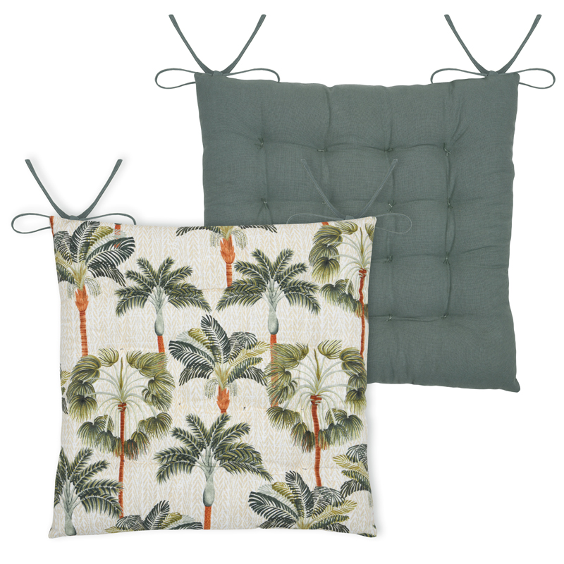 -Trendikäs palmukuviollinen istuintyyny. Istuintyynyllä saat lisättyä istuinmukavuutta tuoliin ja samalla voit muokata kodin sistustusta ja yleisilmettä nopeasti ja vaivattomasti. Toinen puoli tyynystä on palmukuviollinen ja toinen puoli yksivärinen vihertävän harmaa. Tyynyssä on läpitikkaukset/heftaukset, minkä ansiosta täyte pysyy paikoillaan.