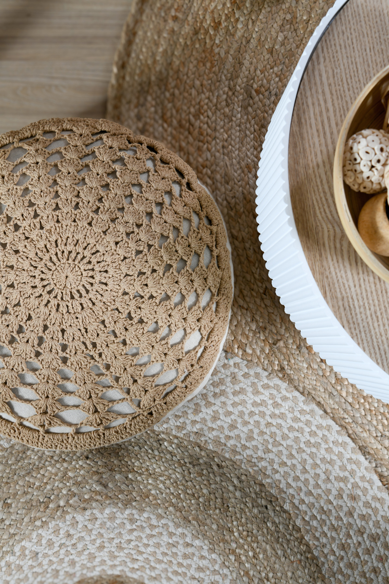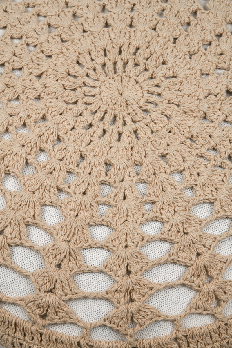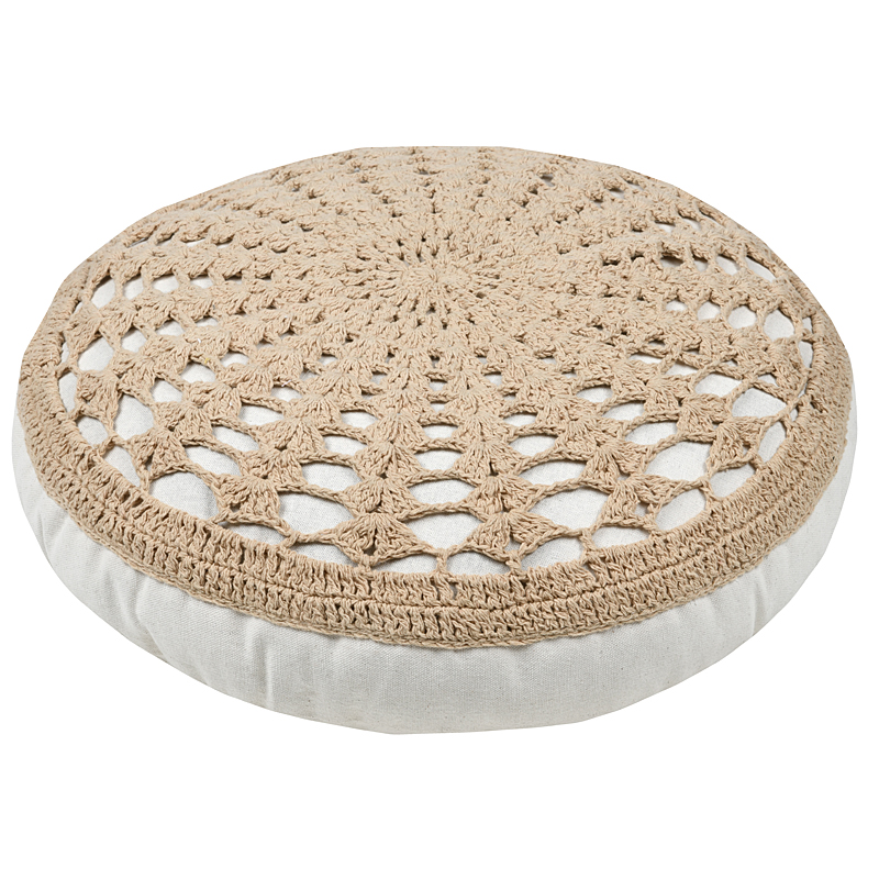 -Todella hieno boho henkinen, pyöreä istuintyyny. Istuintyyny on päällystetty valkoisella kankaalla ja tämän päälle on virkattu hieno beigen värinen  kuvio. Tämän istuintyynyn paksuus on n. 8cm.