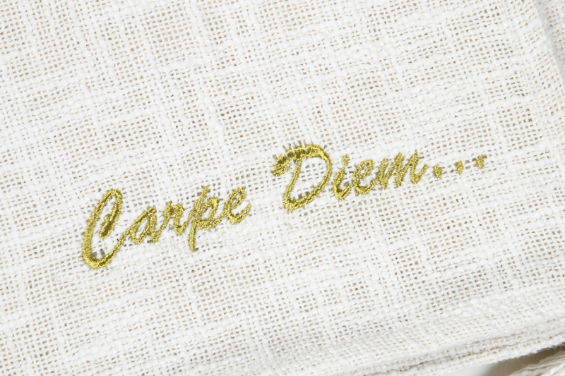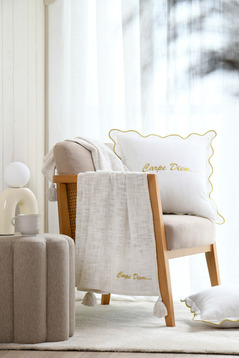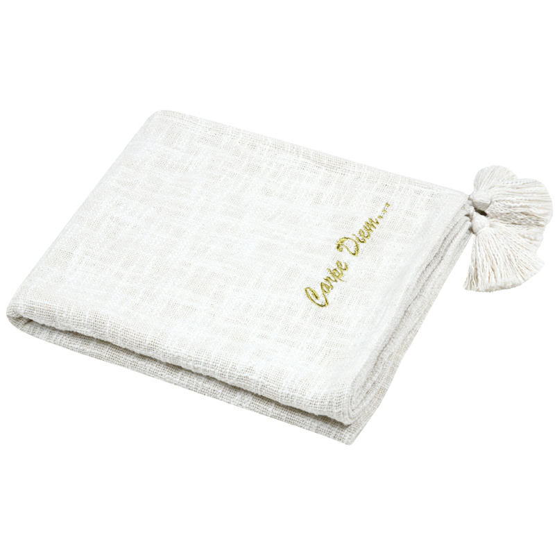 -Hieno ja tyylikäs Carpediem tekstillä varustettu torkkupeitto. Kulmissa on trendikkäät ja kivat tupsut, mitkä antavat torkkupeitolle kivasti ilmettä.
