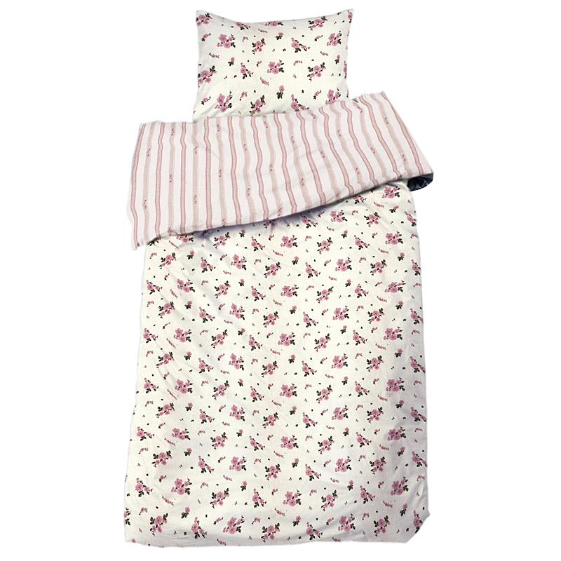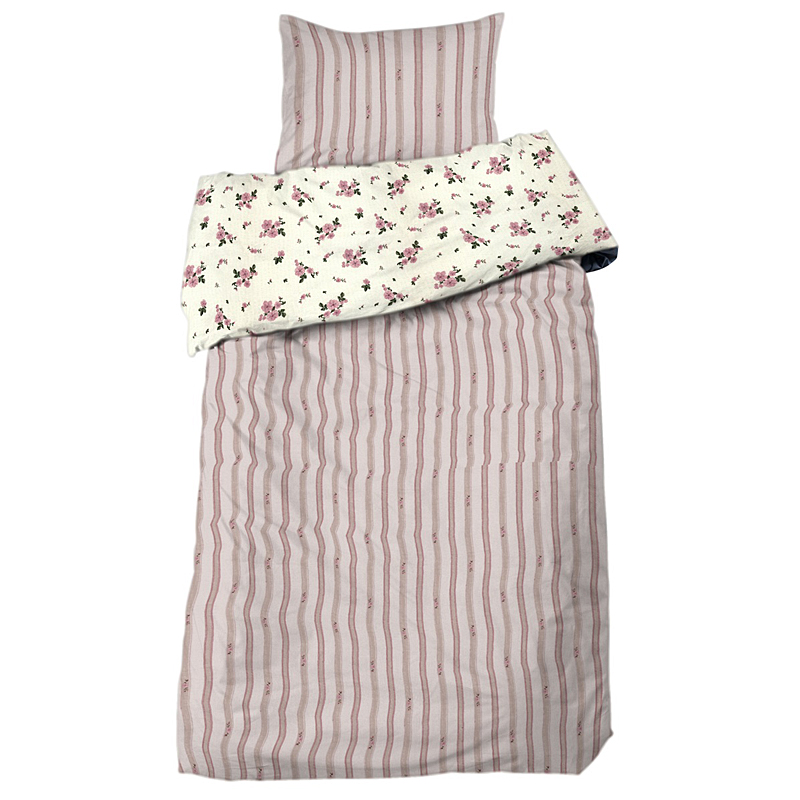 -Pussilakanasetti kahdella eri kuosilla, joten sinun ei tarvitse valita! Toinen puoli on kukkakuosi valkoisella pohjalla ja toinen puoli on raidallinen, missä on pieniä kukkakoristeita.
