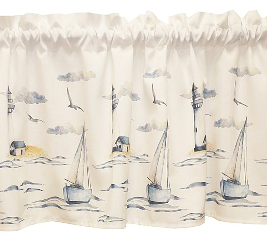 Kaunis merihenkinen kappakangas. Valmiiksi ommellut kujat verhotangolle yläreunassa. Ompele omien mittojesi mukaan sopivan pituiseksi.