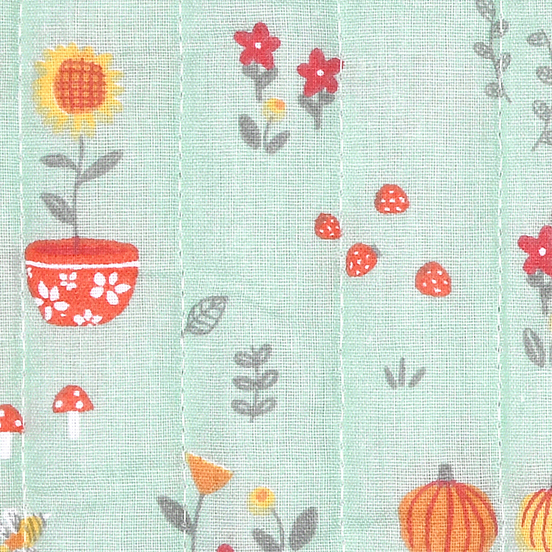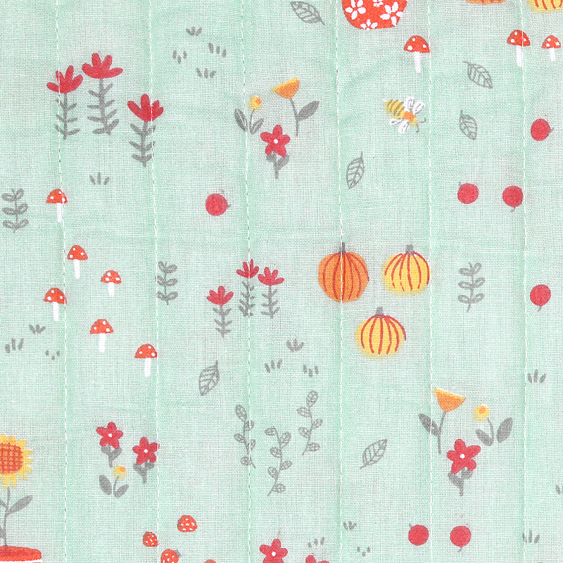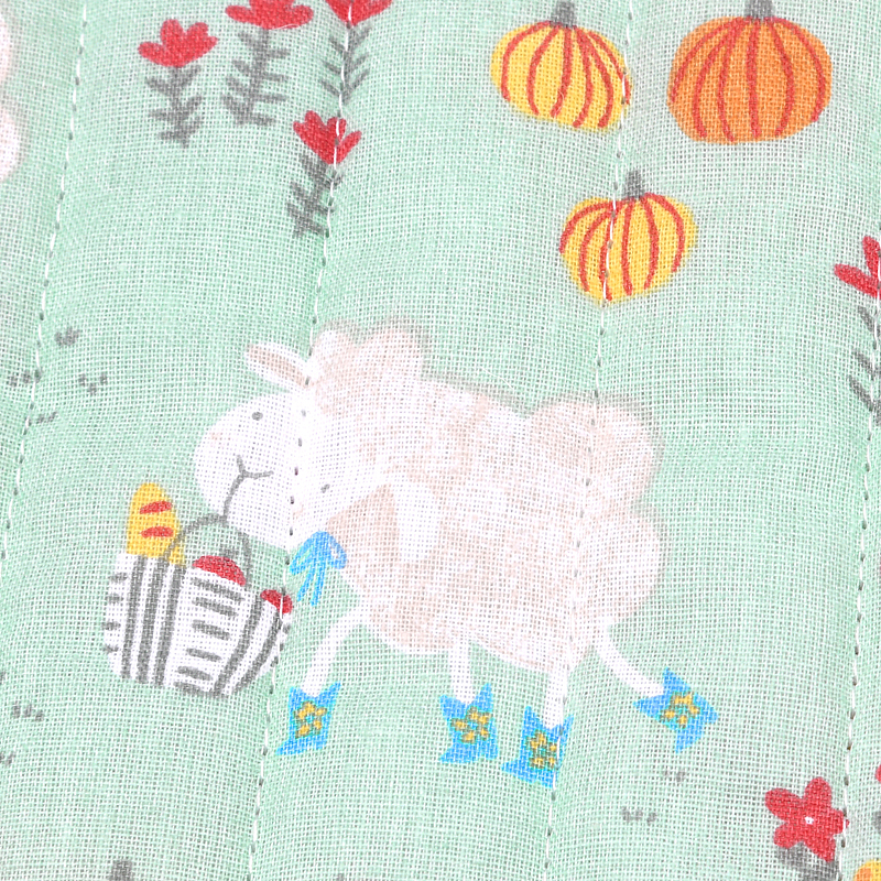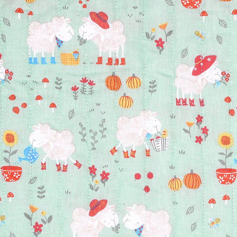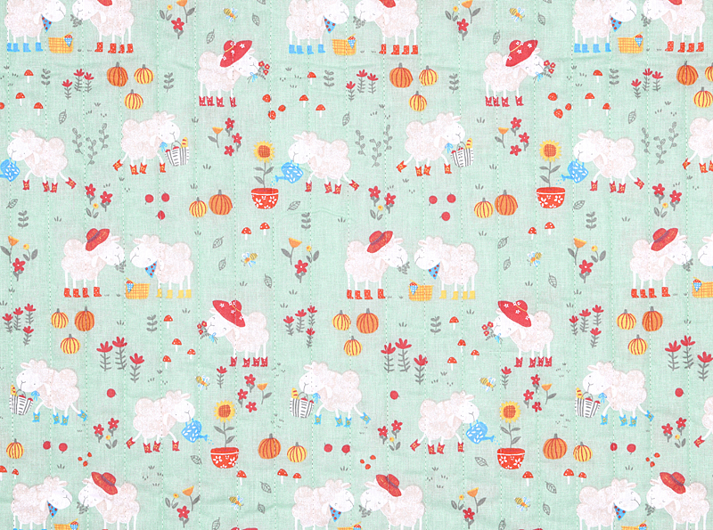 Ihanan suloinen lasten kaksipuoleinen tikkikangas päiväpeitteisiin ja muuhunkin sisustukseen. Kankaan toisella puolella on lammas kuviota ja toisella puolella on pieniä kukkia, sieniä ja kurpitsoja.