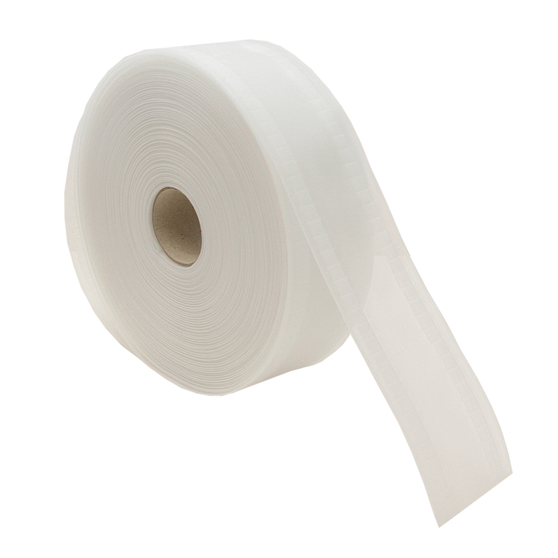 -Läpinäkyvä, 8 cm leveä aaltolaskosnauha. Nauha laskostuu kiskon tai tangon alle, joten tuote ei sovellu verhoihin