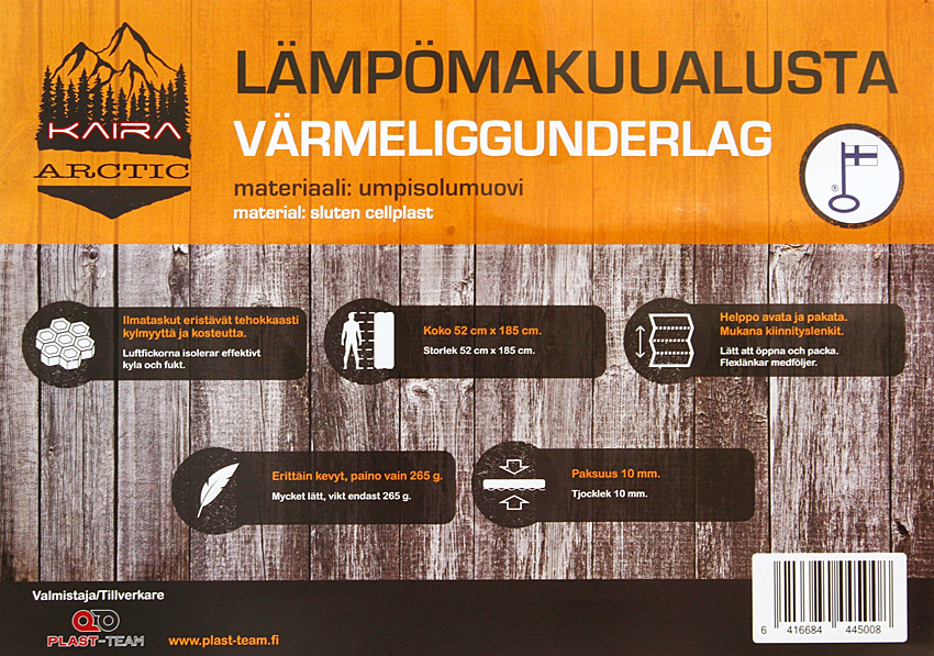 Reilun kokoinen 3 vuodenajan makuualusta, kevät- kesä ja syyskäyttöön. Umpisolumuovi ja alustassa olevat