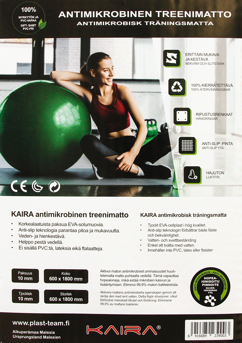 Kaira antimikrobinen treenimatto ripustusrenkailla. Ripustusrenkaat toisessa päässä. Korkealaatuista EVA-solumuovia. Anti-slip teknologia parantaa pitoa ja mukavuutta. Veden- ja hienkestävä.