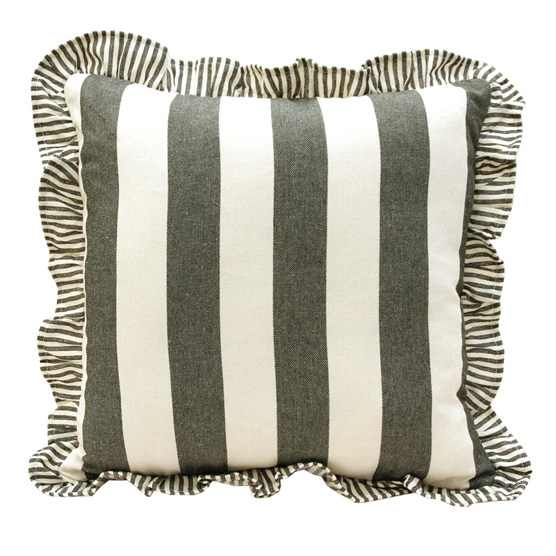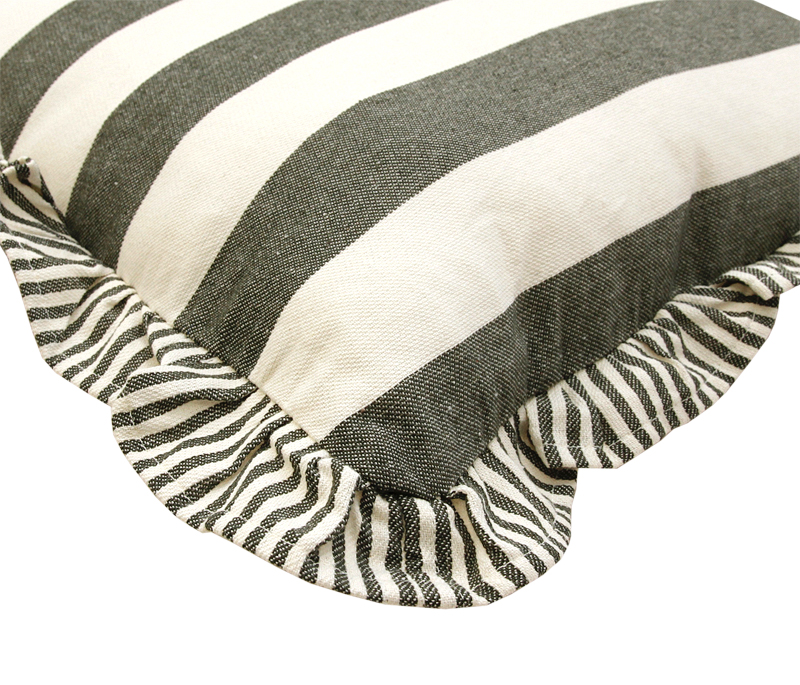 -Ihana raidallinen Filippa koristetyyny, missä on kauniit kapearaidalliset röyhelöt reunoissa.