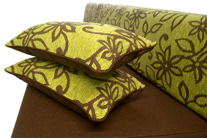 Tähän työhön asiakas toimitti oman kankaan. Limenvihreä ja ruskea on hyvä yhdistelmä.