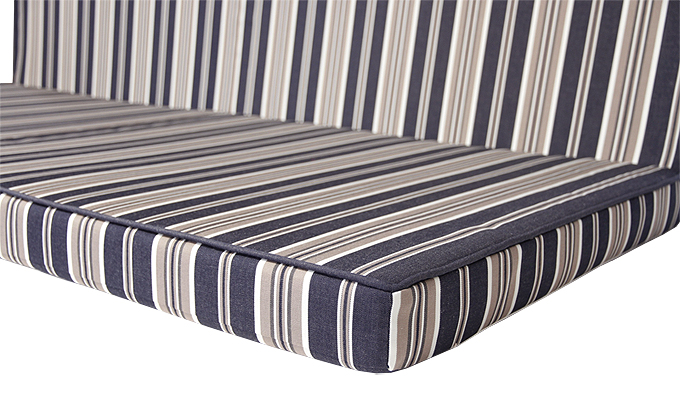 Tässä työssä käytetty ulkokalusteiden päällystämiseen soveltuvaa markiisia. Säänkestävällä Gardiff Marin Markiisilla on erinomaiset vesitorni/-valonkestoarvot. Asiakkaan toiveesta ommeltiin tereet pehmusteen yläosaan.