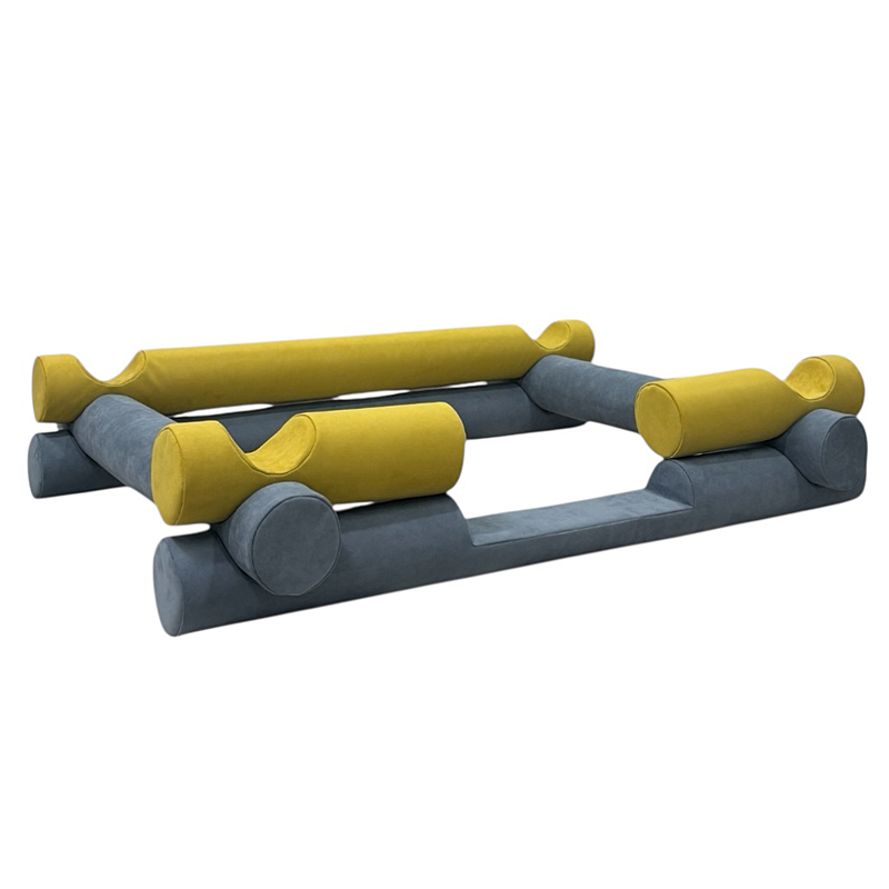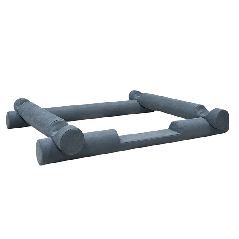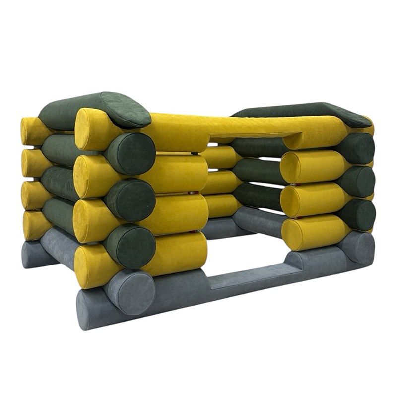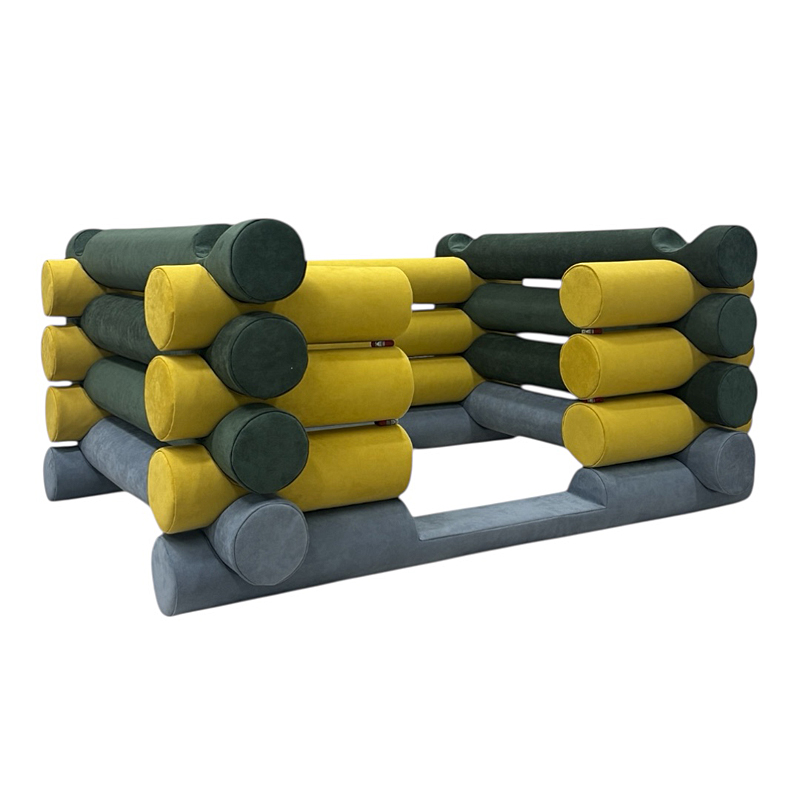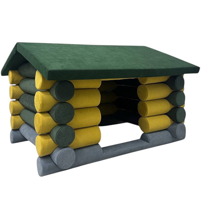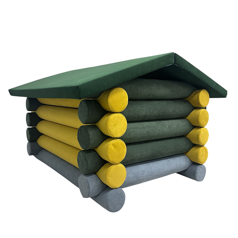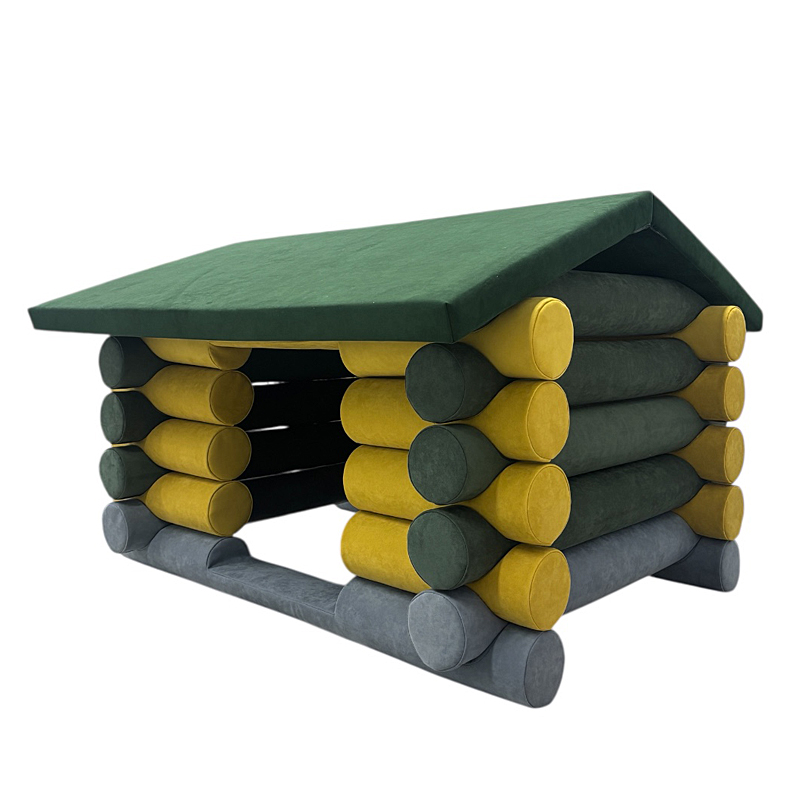 Tässä tehtiin asiakkaalle hirsimökki/maja vaahtomuovista. Kankaana on laadukas Lauritzonin Alcantara kangas. Päälliset ovat tarranauha kiinnityksellä eli ne saa tarvittaessa otettua pois pesua varten. Katto tehtiin jämäkästä/kovemmasta solumuovista, jotta se pysyy kasassa ja ryhdissä paremmin.