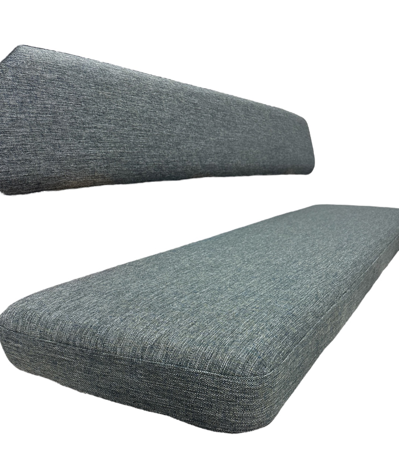 Tässä teimme asiakkaalle hienot istuin ja selkänojapehmusteet. Asiakas halusi näihin reunaan ja kulmiin pyöristyksiä, millä pehmusteisiin saatiin kivaa pyöreämpää ja pehmeämpää ilmettä. Asiakas toimitti näihin meille oman päälliskankaan.