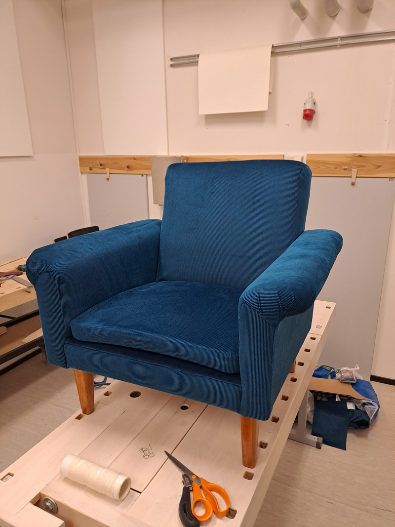 Tässä asiakas verhoili vanhan nojatuolinsa uudelleen meidän kivalla sinisellä vakosametti verhoilukankaalla. Mitäs olet tästä mieltä, eikö olekin kivan näköinen? Vakosametti kankaita löytyy paljon eri värejä heti varastosta, tässä linkki meidän valikoimaamme: