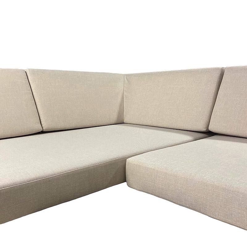 Tässä teimme asiakkaalle ulkokalusteiden istuin- ja selkänojapehmusteet. Selkänoja on alhaalta paksumpi ja ylhäältä kapeampi viistetty muotoselkänoja. Kulmapala leikattiin jiiriin ja liimattiin sen jälkeen yhteen ja päällystys tehtiin myös yhtenäisenä. Näin saatiin kaunis ja toimiva kokonaisuus. Tässä kankaana ihanan rouhea ja pellavamainen Outside terassikangas. Kysy näitä myynnistämme!