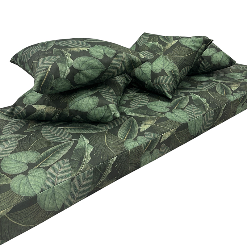 Tässä upea lehtikuviollinen säänkestävä ulkokalustekangas, mistä tehtiin istuinpehmuste ja koristetyynyjä. Eikö olekin upea!